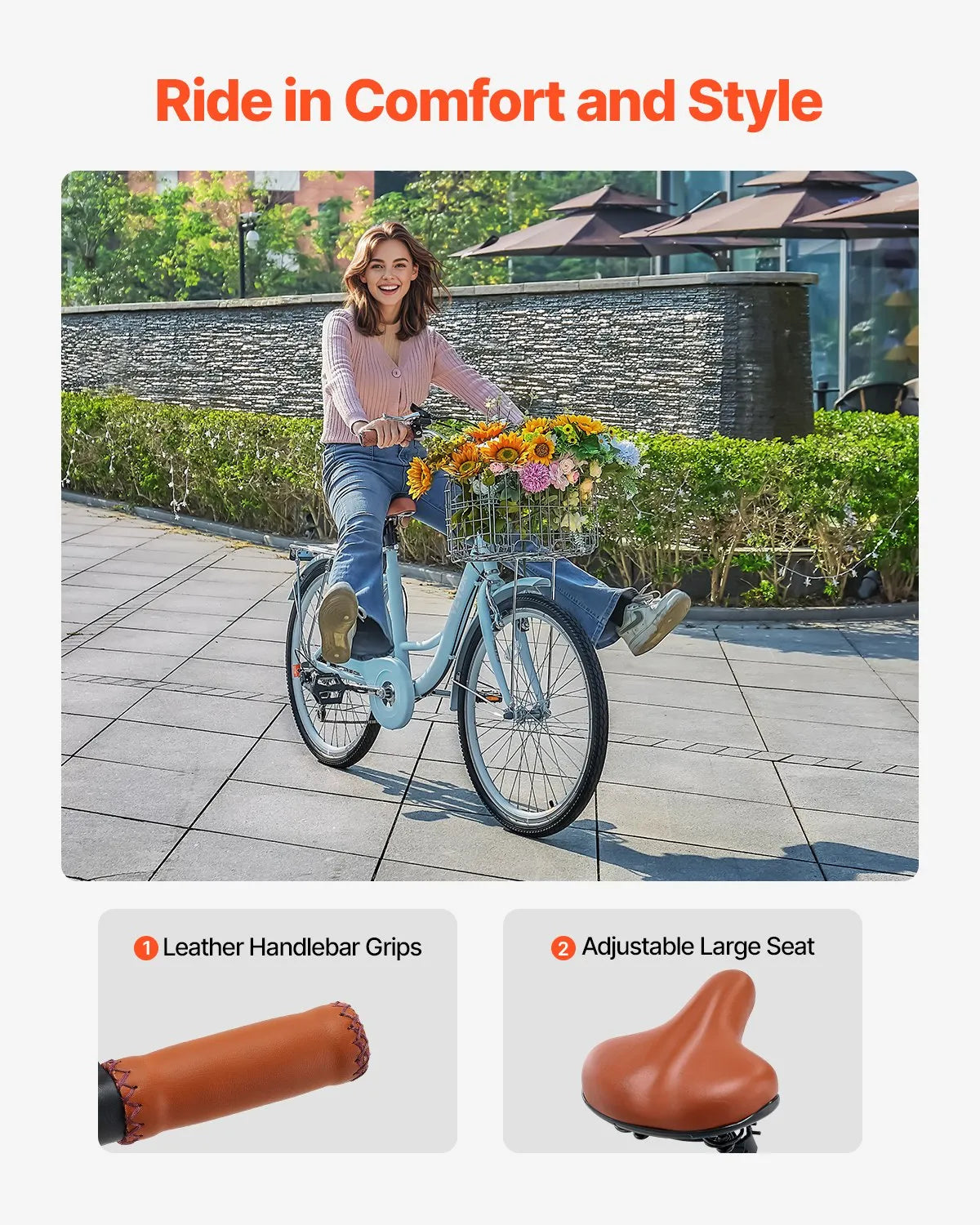 VEVOR Cruiser Bike, 7-Speed, 26-Inch Light Blue Beach Cruiser Bike with Large Capacity Basket and Rear Rack, Secure & Sturdy Cruiser Bike with Adjustable Seat, Fits for Cycling, Exercise & Shopping